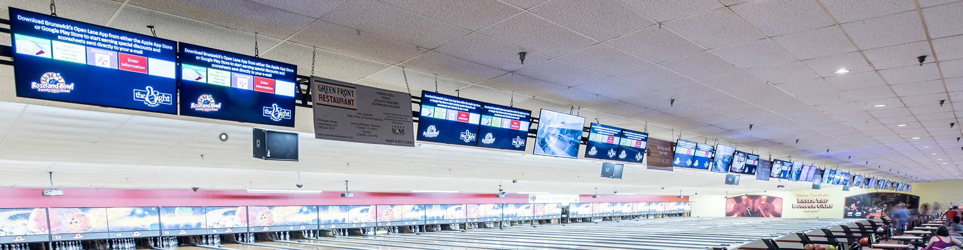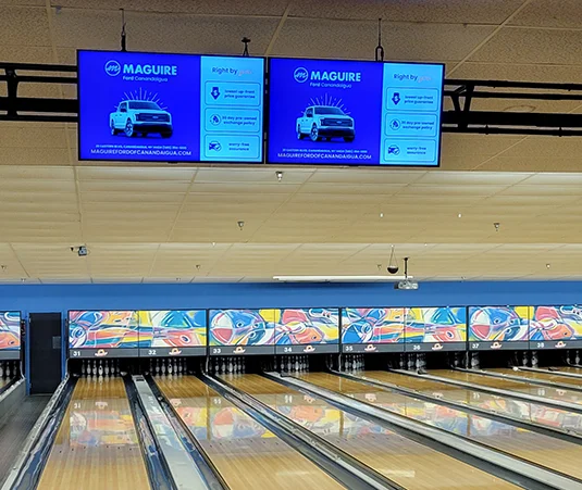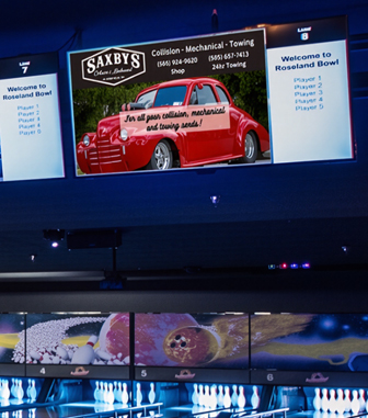 Strategic placement of digital signage advertising screens in high-traffic areas of our bowling & family recreation center will effectively reach a family audience and drive sales. Display dynamic Ads, including images, videos, and animations!